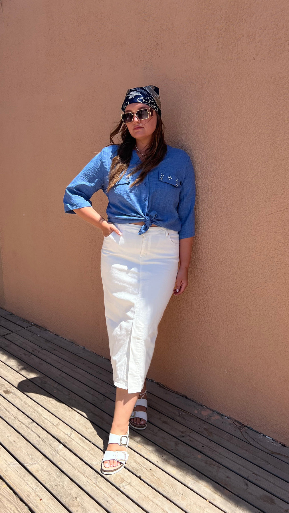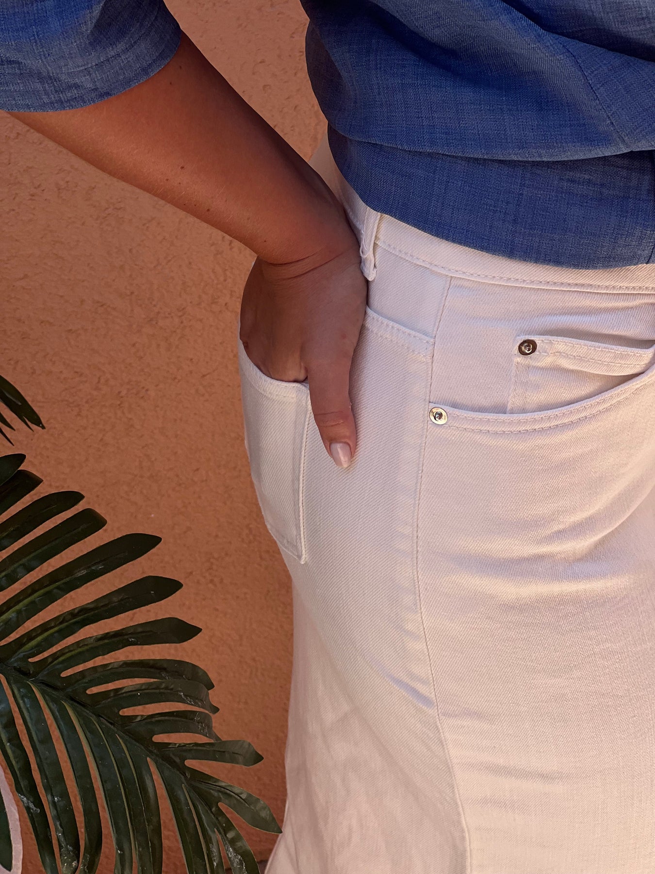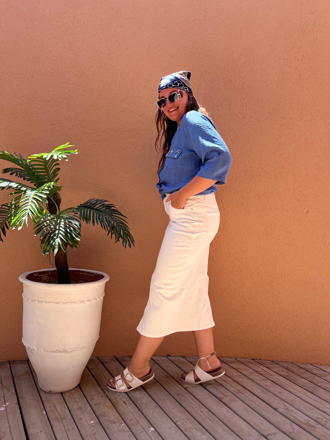• Dieser stilvolle Jeansrock in Midilänge ist ein echtes Figurwunder! Die feste, formende Denimqualität sorgt für einen glättenden Effekt und betont die Silhouette auf elegante Weise. Mit klassischem 5-Pocket-Design, hohem Bund und markanter Teilungsnaht vorn – perfekt kombinierbar für City-Looks oder den Alltag.