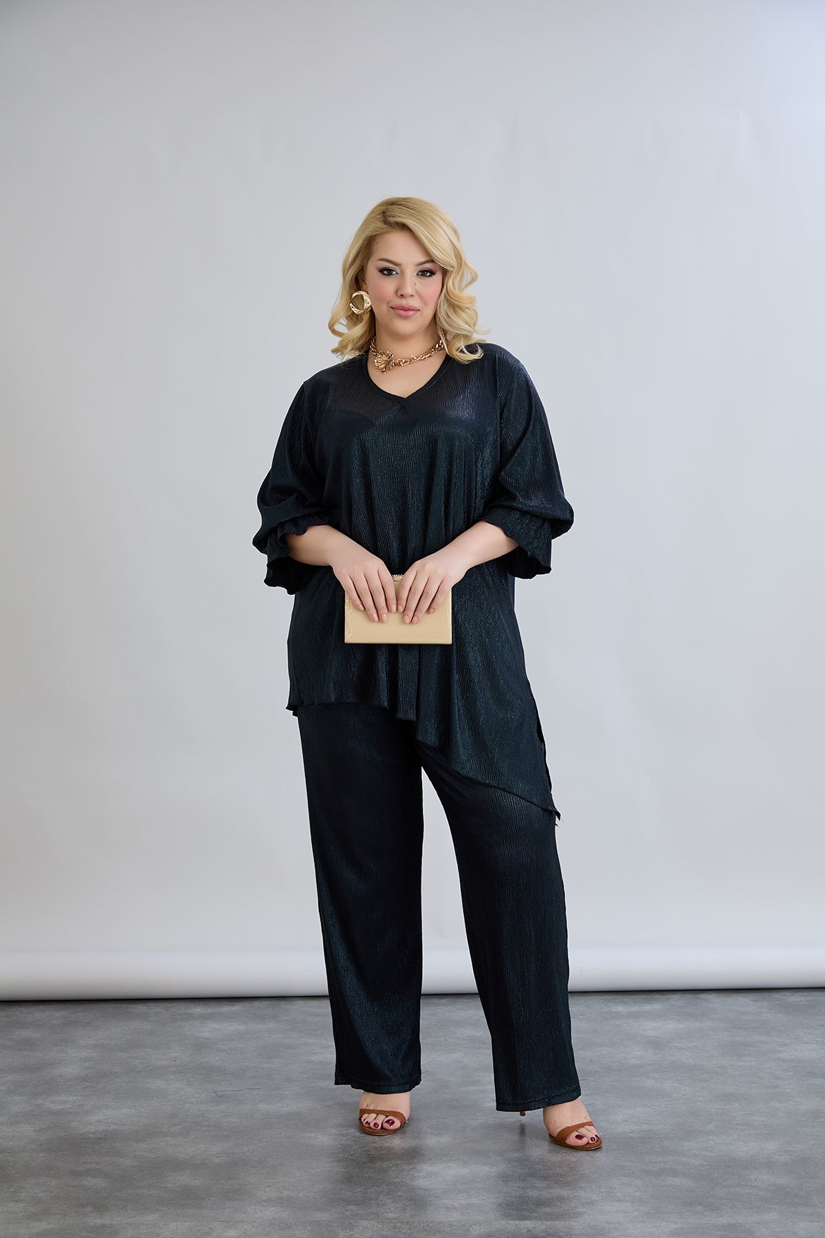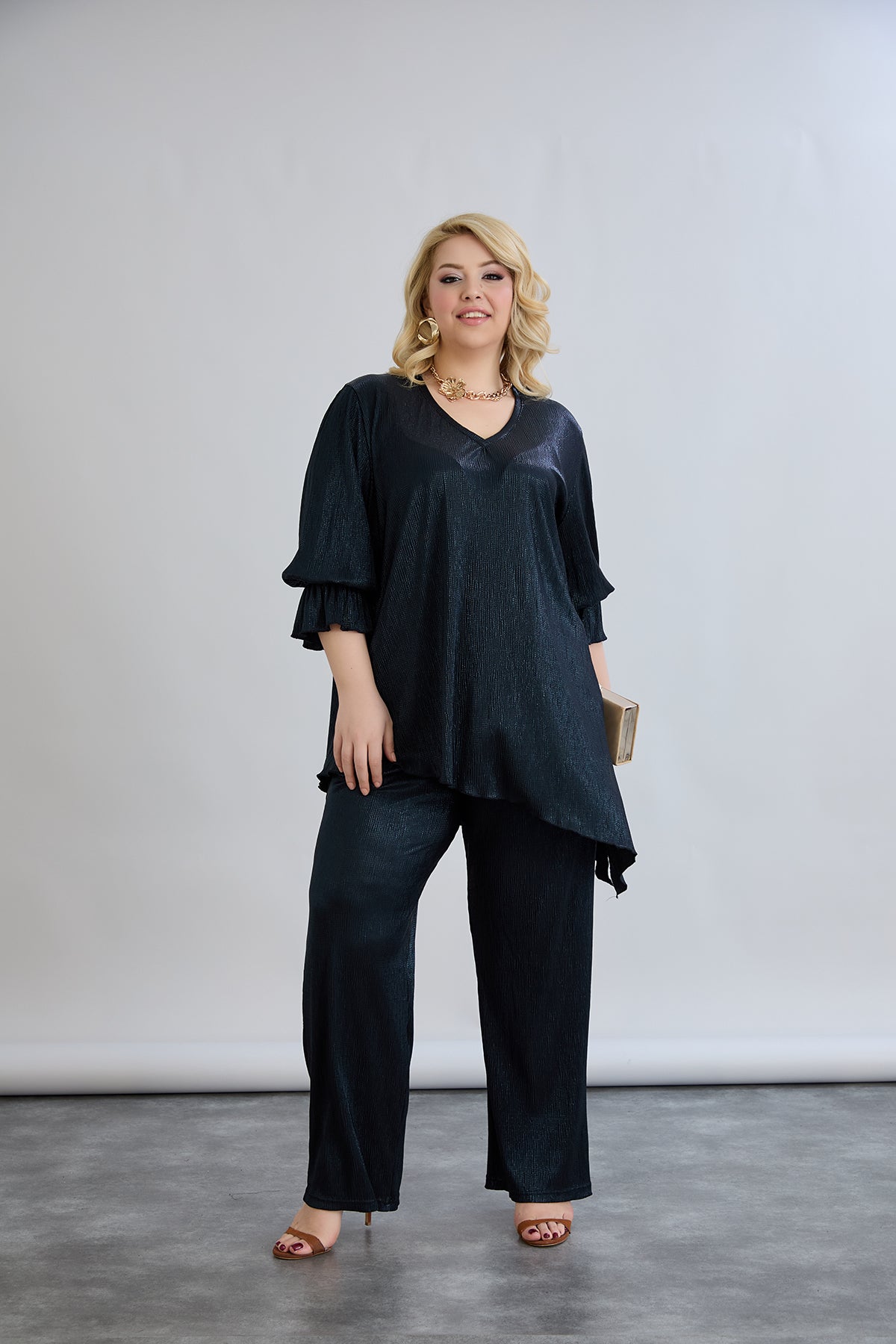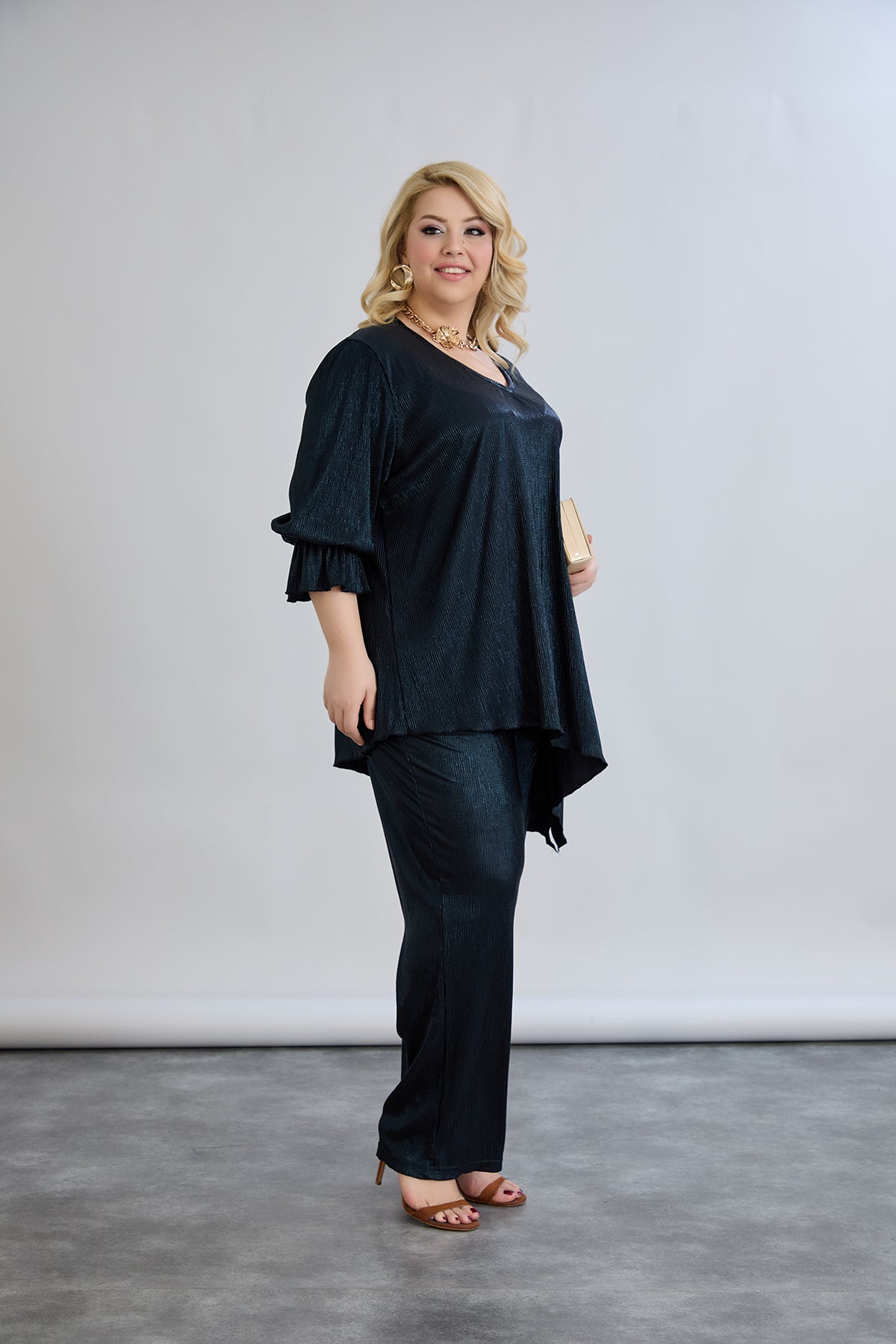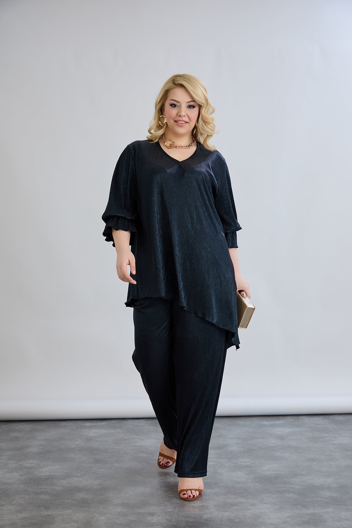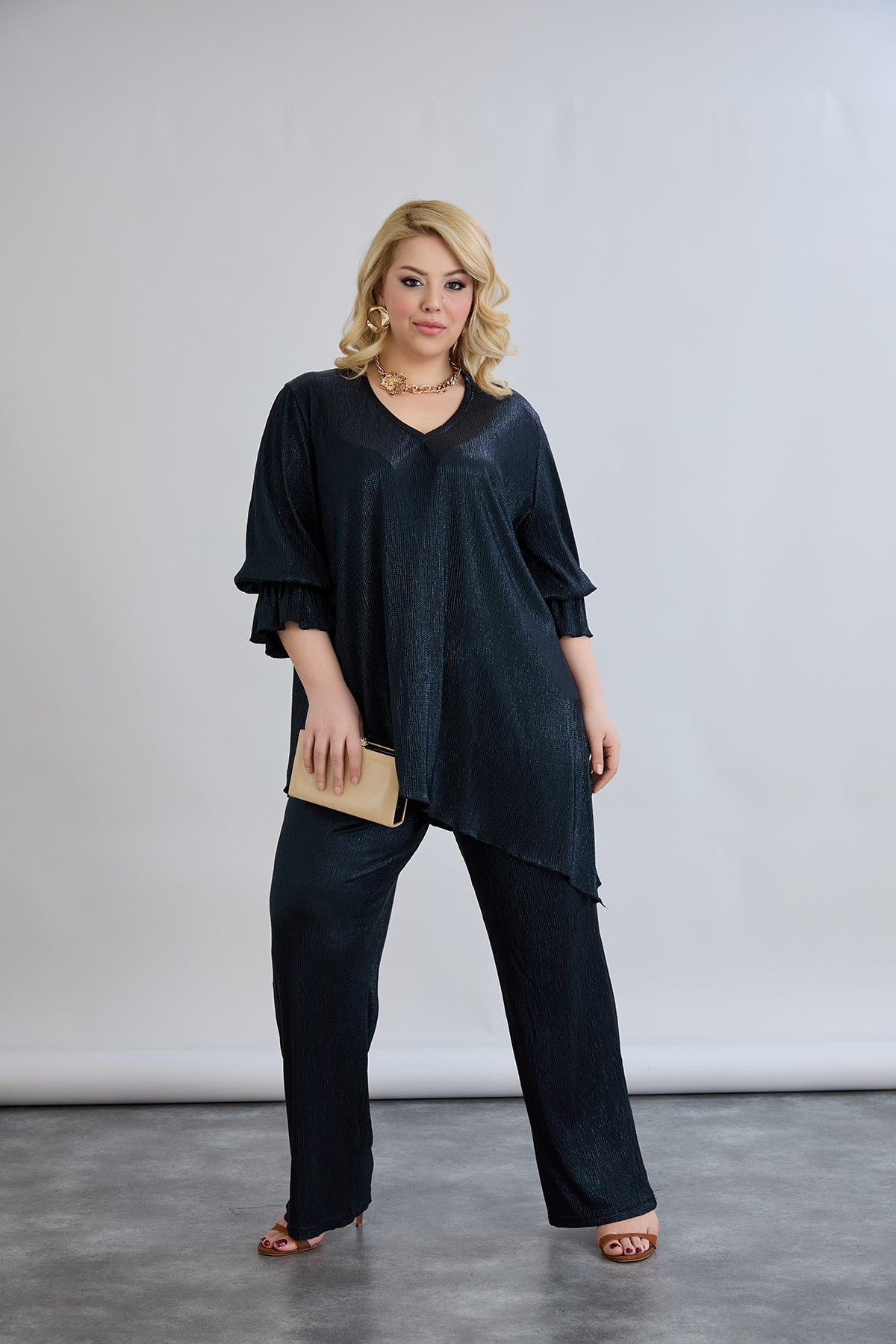 Attraktives und bequemes Set aus Stretchgewebe mit luxuriösem Satineffekt. Fällt schwer und besticht durch seinen Schimmer. Der obere Teil des Sets hat einen V-Ausschnitt und einen asymmetrischen Schnitt, der eine fließende Silhouette und eine märchenhafte Ausstrahlung verleiht. Die Ärmel sind 7/8 lang und schließen mit elastischen Volants ab. Die Hose mit weitem Bein hat zwei Seitentaschen, die für Bewegungsfreiheit sorgen. Eine wirklich raffinierte Silhouette, unverzichtbar für besondere und festliche Anlässe.