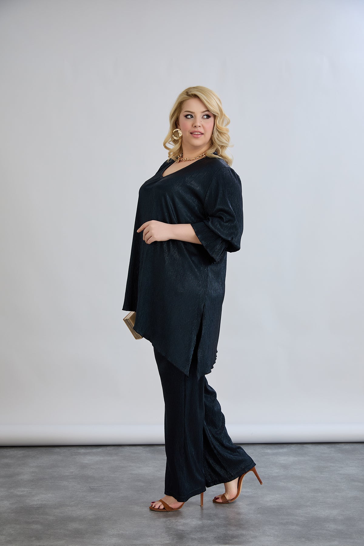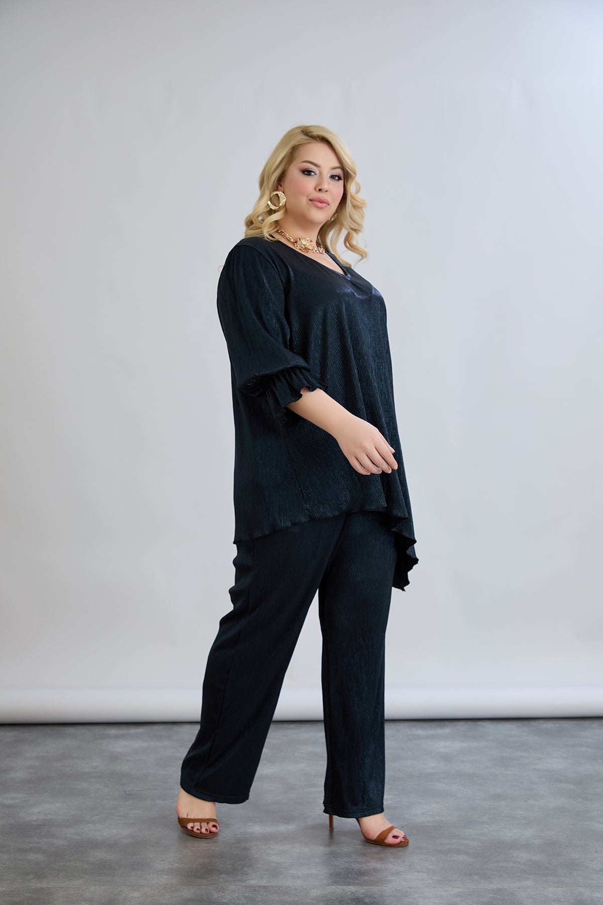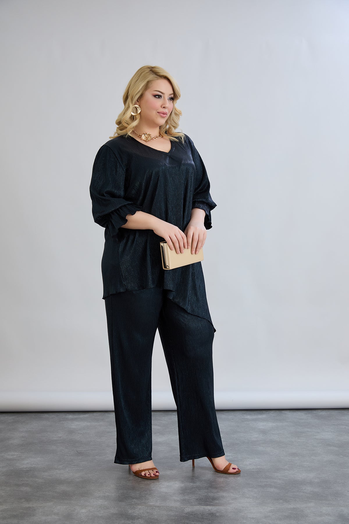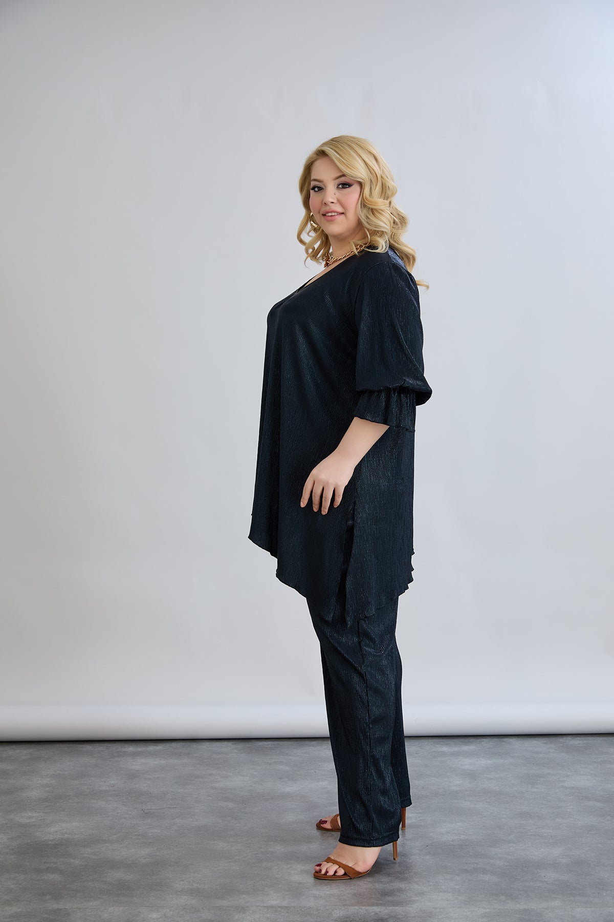 Attraktives und bequemes Set aus Stretchgewebe mit luxuriösem Satineffekt. Fällt schwer und besticht durch seinen Schimmer. Der obere Teil des Sets hat einen V-Ausschnitt und einen asymmetrischen Schnitt, der eine fließende Silhouette und eine märchenhafte Ausstrahlung verleiht. Die Ärmel sind 7/8 lang und schließen mit elastischen Volants ab. Die Hose mit weitem Bein hat zwei Seitentaschen, die für Bewegungsfreiheit sorgen. Eine wirklich raffinierte Silhouette, unverzichtbar für besondere und festliche Anlässe.