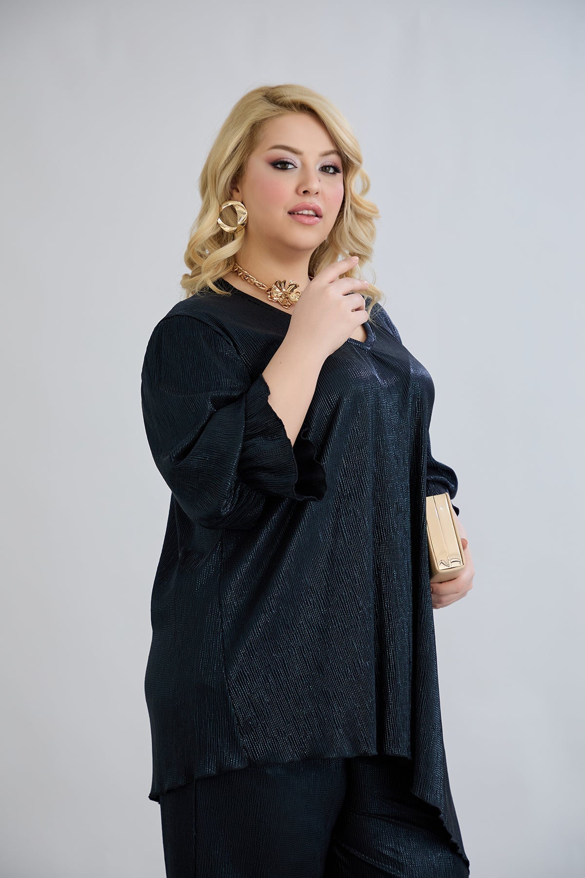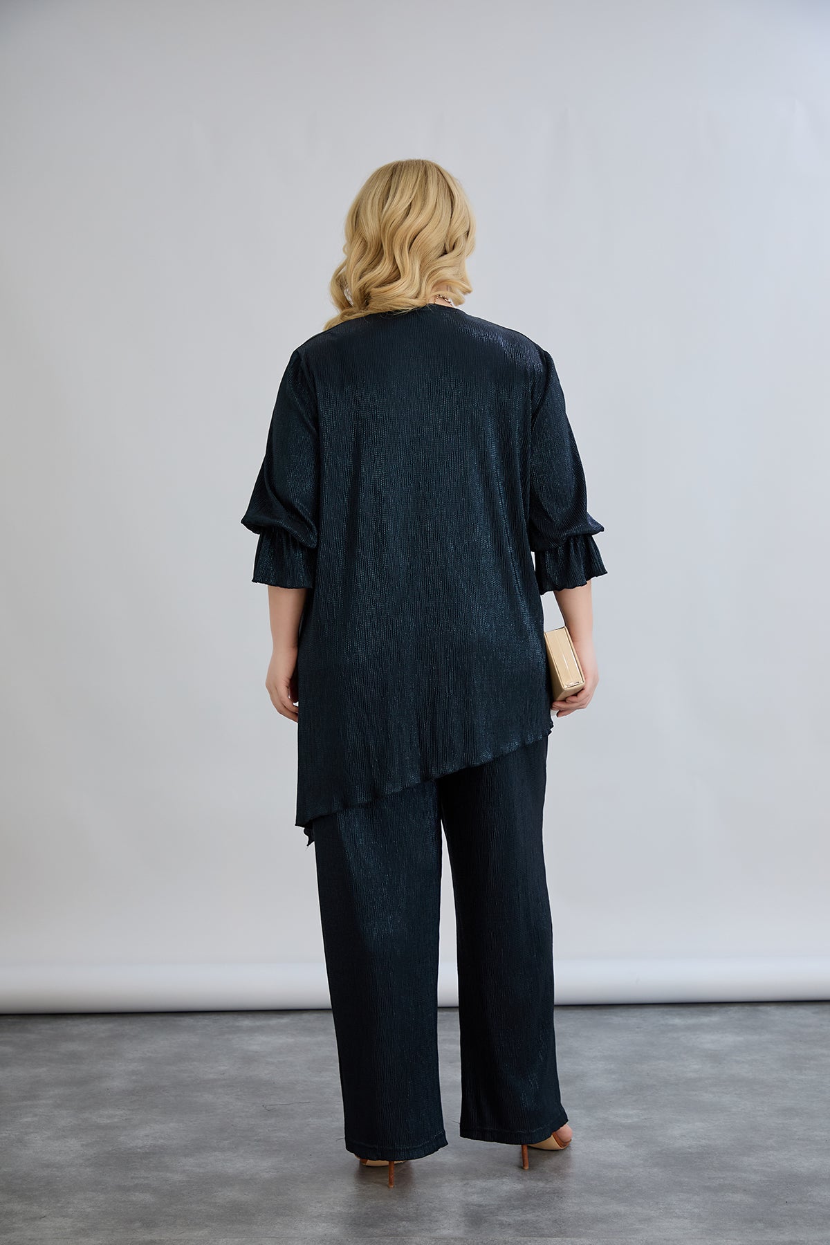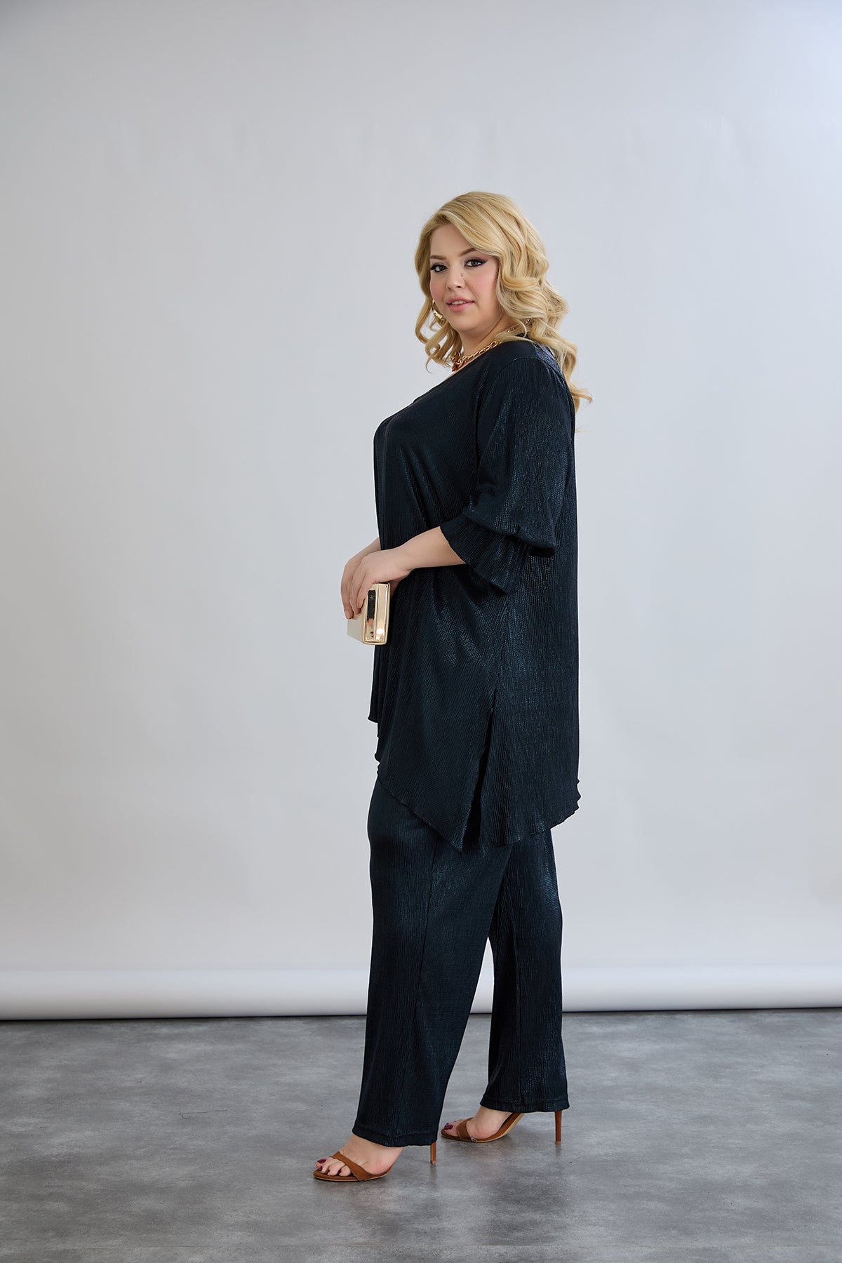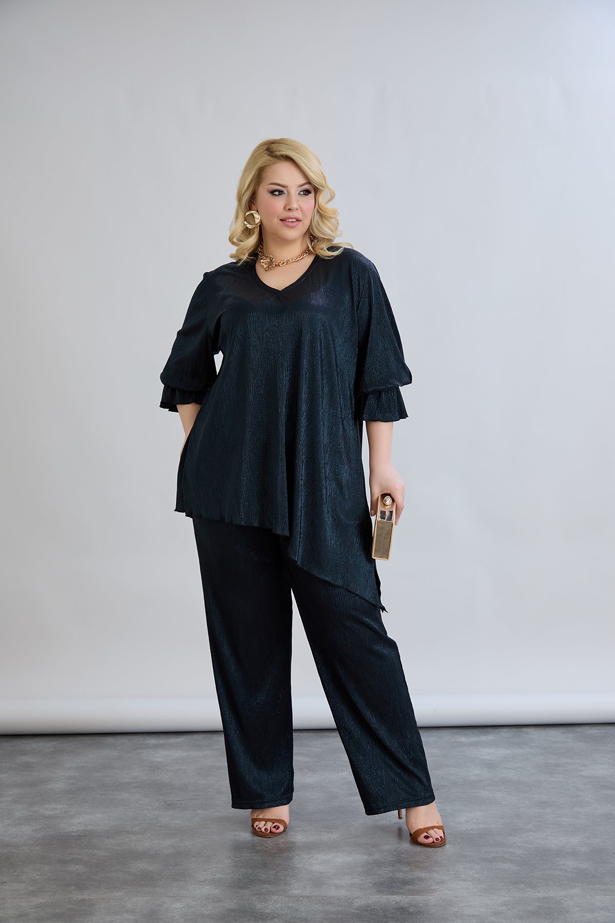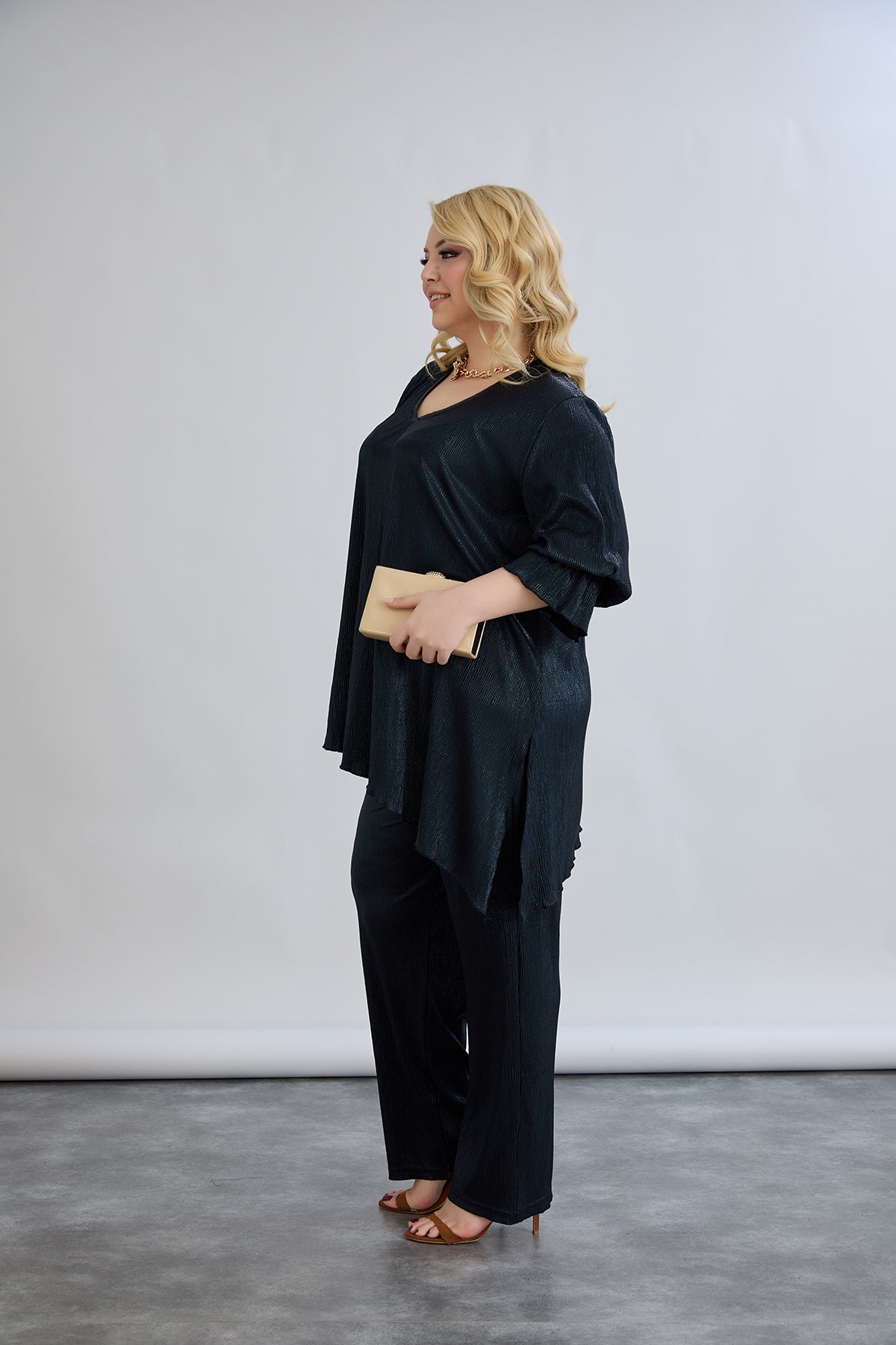 Attraktives und bequemes Set aus Stretchgewebe mit luxuriösem Satineffekt. Fällt schwer und besticht durch seinen Schimmer. Der obere Teil des Sets hat einen V-Ausschnitt und einen asymmetrischen Schnitt, der eine fließende Silhouette und eine märchenhafte Ausstrahlung verleiht. Die Ärmel sind 7/8 lang und schließen mit elastischen Volants ab. Die Hose mit weitem Bein hat zwei Seitentaschen, die für Bewegungsfreiheit sorgen. Eine wirklich raffinierte Silhouette, unverzichtbar für besondere und festliche Anlässe.