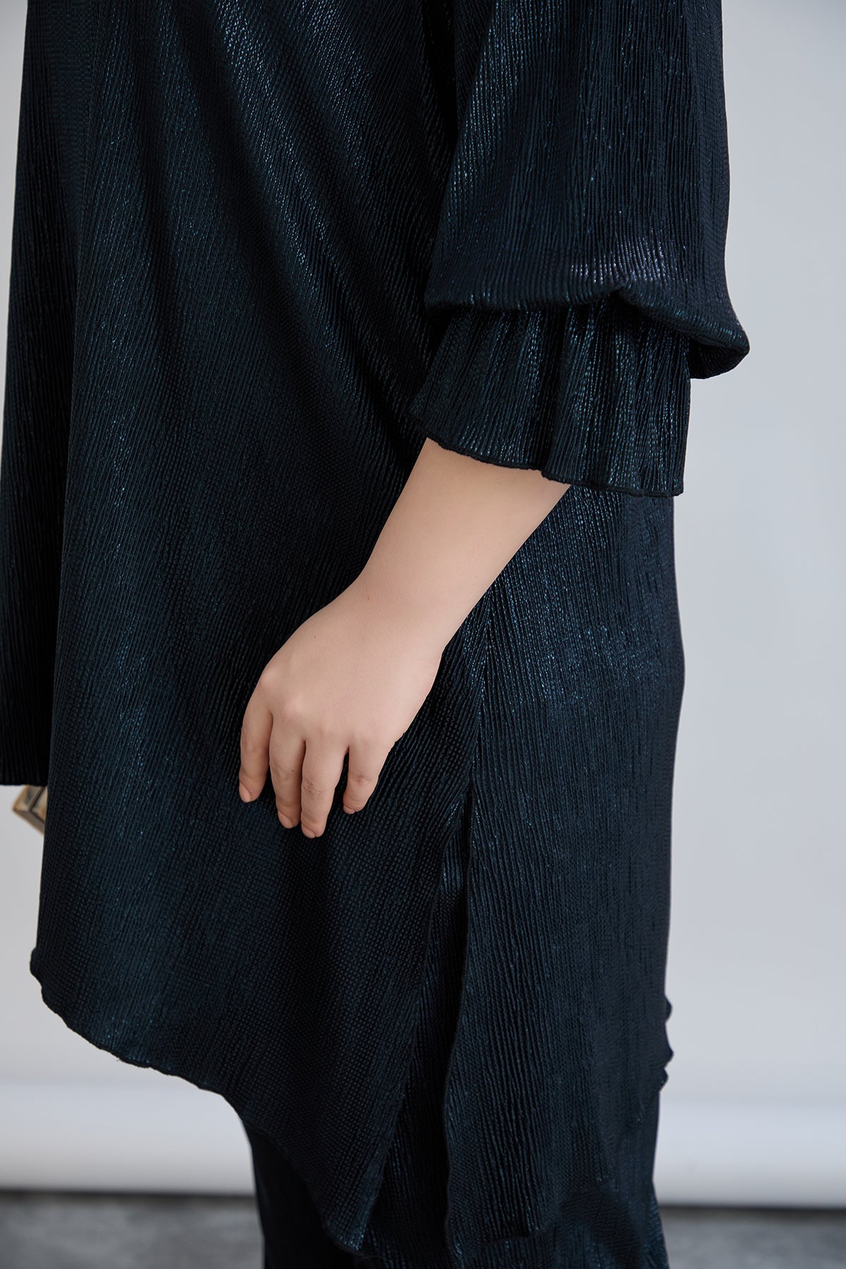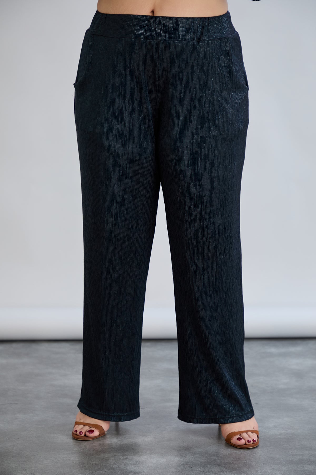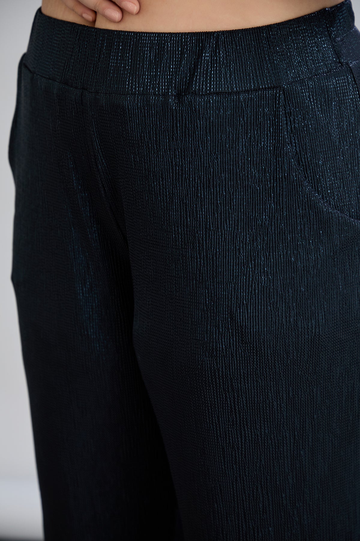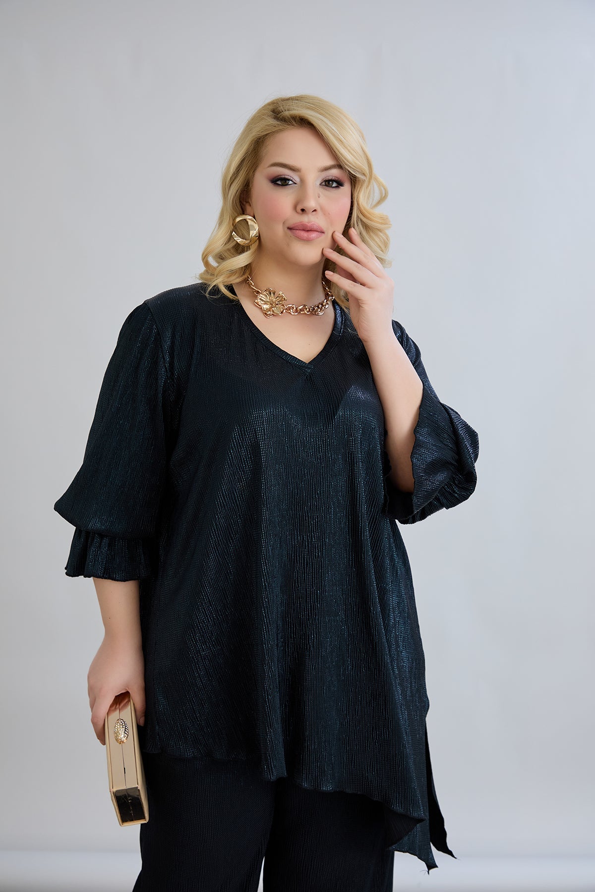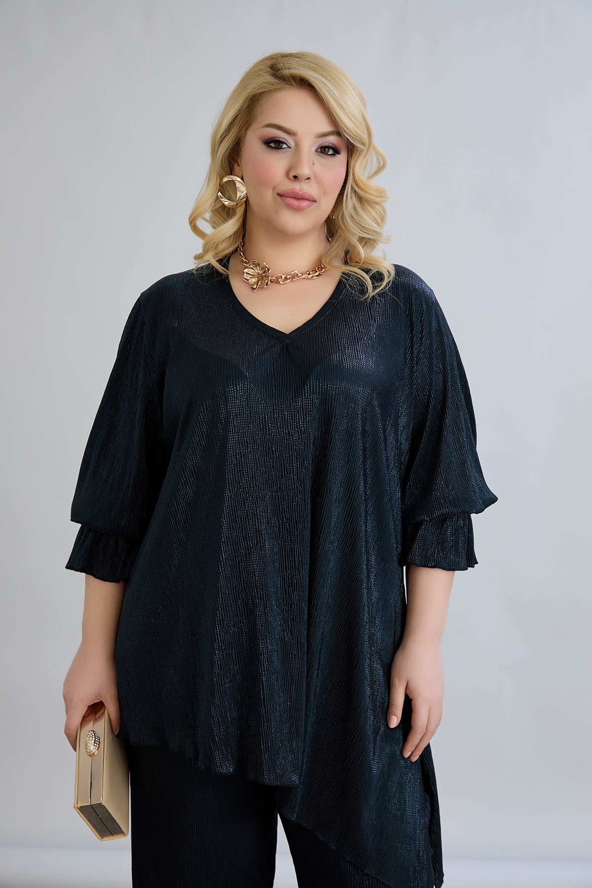 Attraktives und bequemes Set aus Stretchgewebe mit luxuriösem Satineffekt. Fällt schwer und besticht durch seinen Schimmer. Der obere Teil des Sets hat einen V-Ausschnitt und einen asymmetrischen Schnitt, der eine fließende Silhouette und eine märchenhafte Ausstrahlung verleiht. Die Ärmel sind 7/8 lang und schließen mit elastischen Volants ab. Die Hose mit weitem Bein hat zwei Seitentaschen, die für Bewegungsfreiheit sorgen. Eine wirklich raffinierte Silhouette, unverzichtbar für besondere und festliche Anlässe.